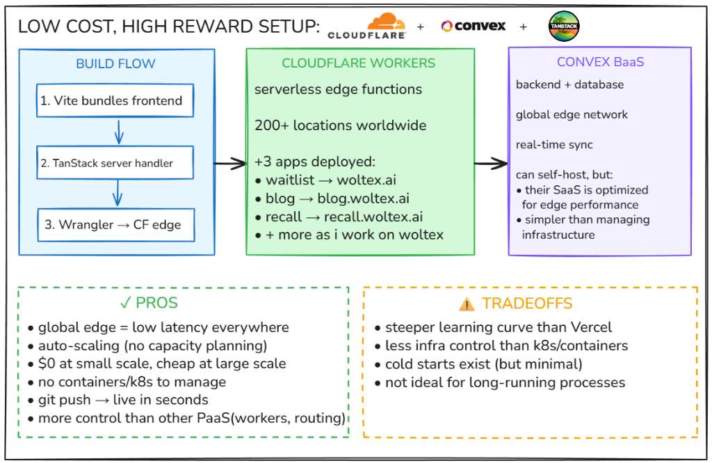 The short answer: Cloudflare Workers for the frontend and server-side rendering, Convex for backend logic and database.